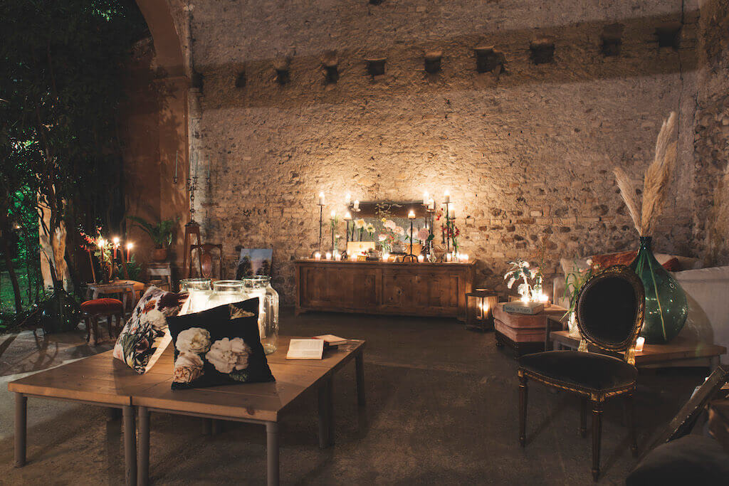 Planned and designed by the talented team, Follia delle Rose. the naturally beautiful venue was the perfect location for their Italian wedding, which was decorated with antique furniture, mirrors, candles, pampas grass, floral teapots and an actual café stand with a framed quote by Gertrude Stein.